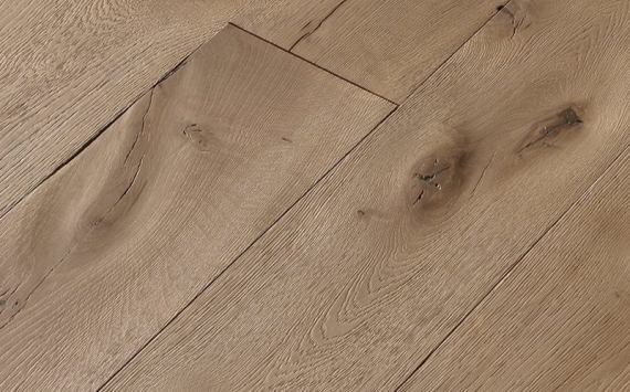 Engineered wood planks floor in Oak: brushed, stained, aged effect, hand carved, varnished.